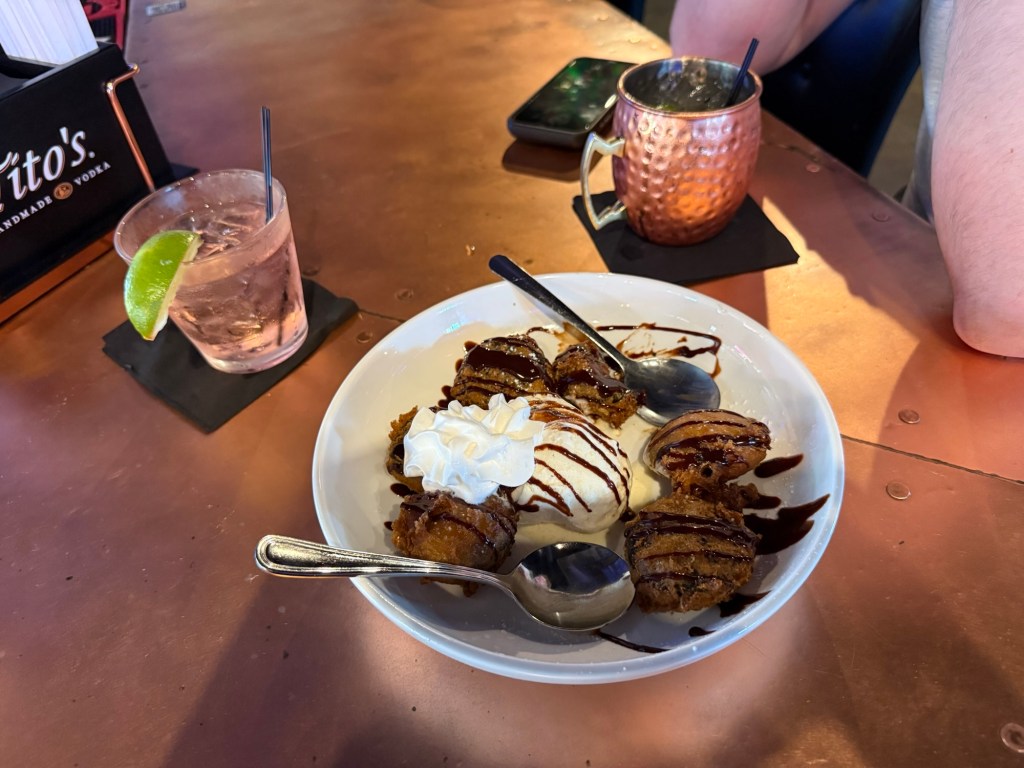 Very healthy southern breakfastDrinks and deep fried Oreos at the nearby bar, my first time having anything like this and it was SO good!!I made penne with Rao’s Marinara sauce and shredded chicken for dinner but we were too hungry and forgot a pic of the finished product.
