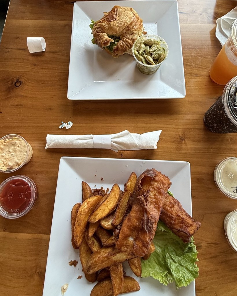 Lunch at Never Enough Thyme. Pesto pasta salad, chicken salad sandwich, and potato wedges were all 10/10, fish was cooked perfectly but was very bland so I would probably not order it again.