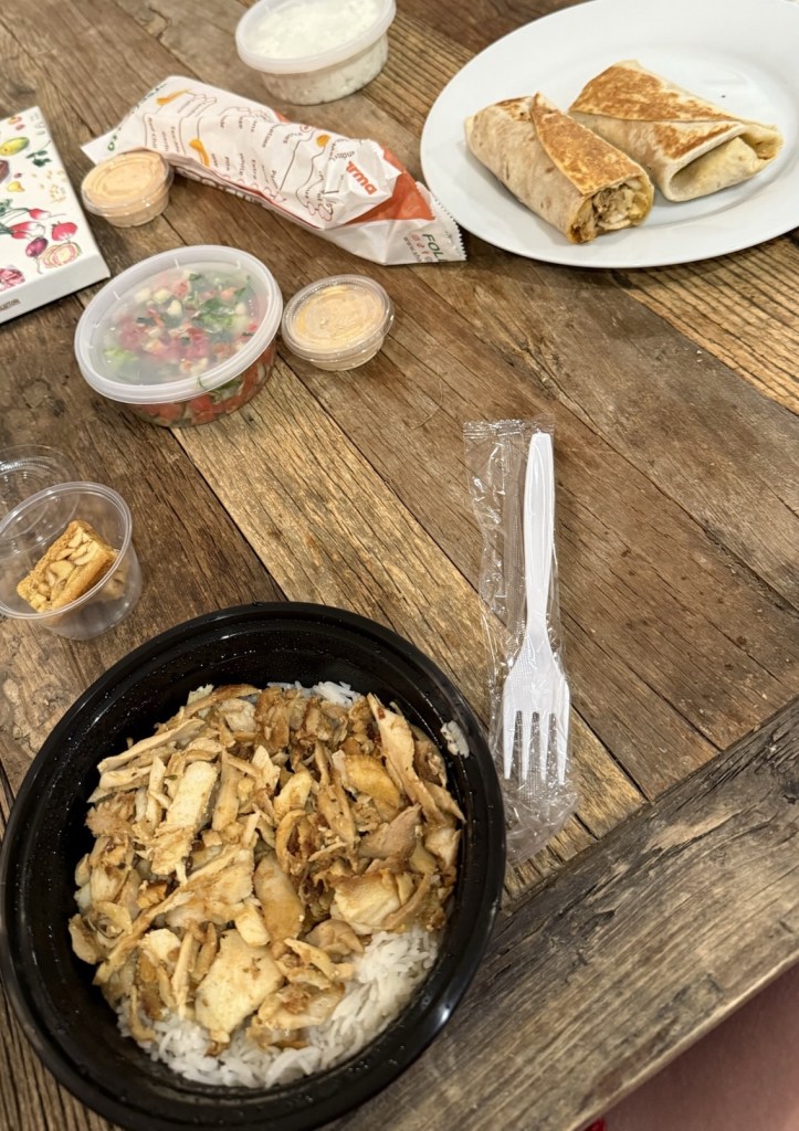 Dinner, I got chicken and rice and T got shwarma, it was pretty good but not great, also got baklava and it was extremely bland. We won’t be reordering but it was fun to try! -